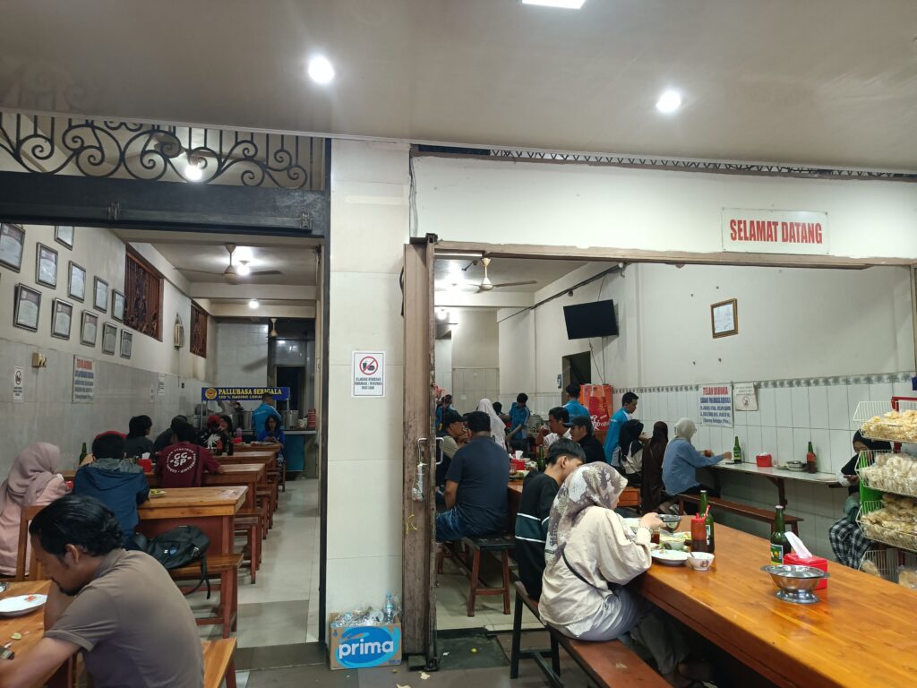Jangan bayangkan restoran modern ketika datang ke Pallu Basa Serigala. Tempat ini justru mempertahankan konsep warung makan sederhana dengan meja kayu panjang dan dinding penuh foto serta testimoni pengunjung. Namun justru kesederhanaan itulah yang membuat tempat ini terasa hangat dan otentik.